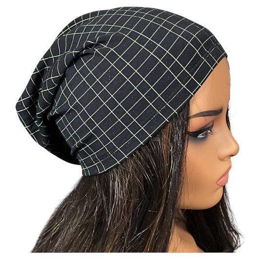 Black and Green Grid Print Slouchy Beanie Cap