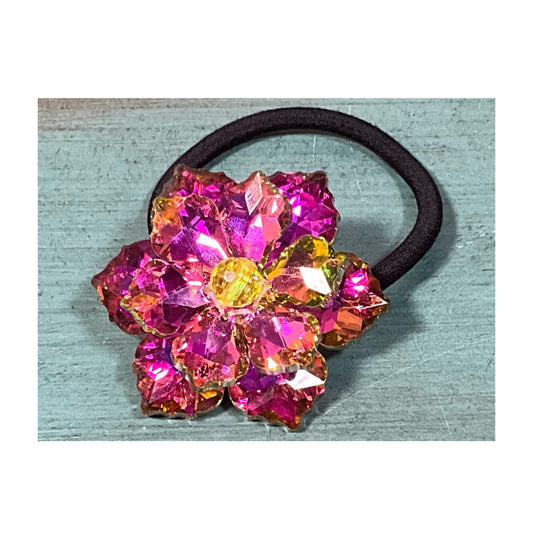Fuchsia Pink and Yellow Rhinestone Flower Ponytail Holder