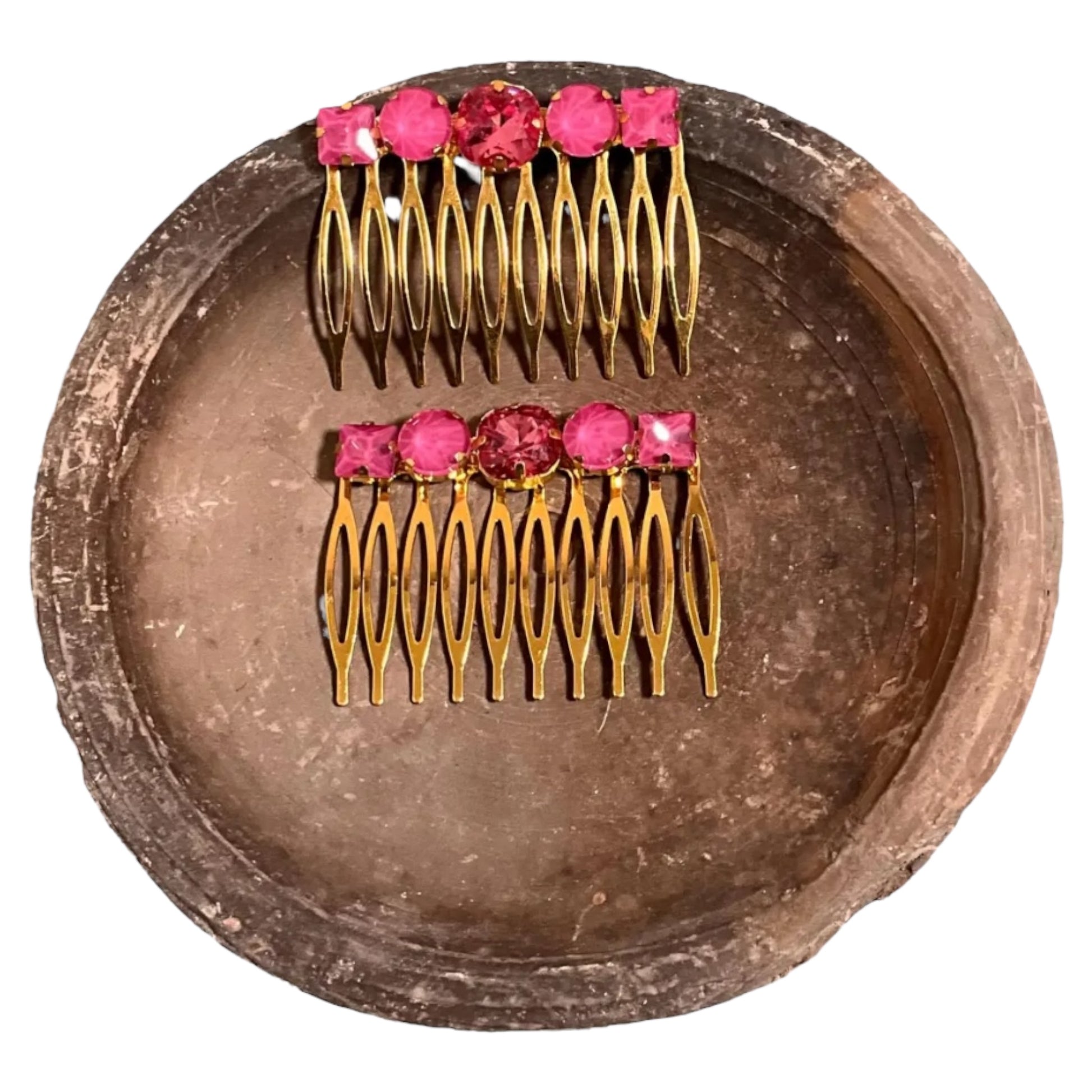 Pink Rhinestones on Gold Hair Comb Set