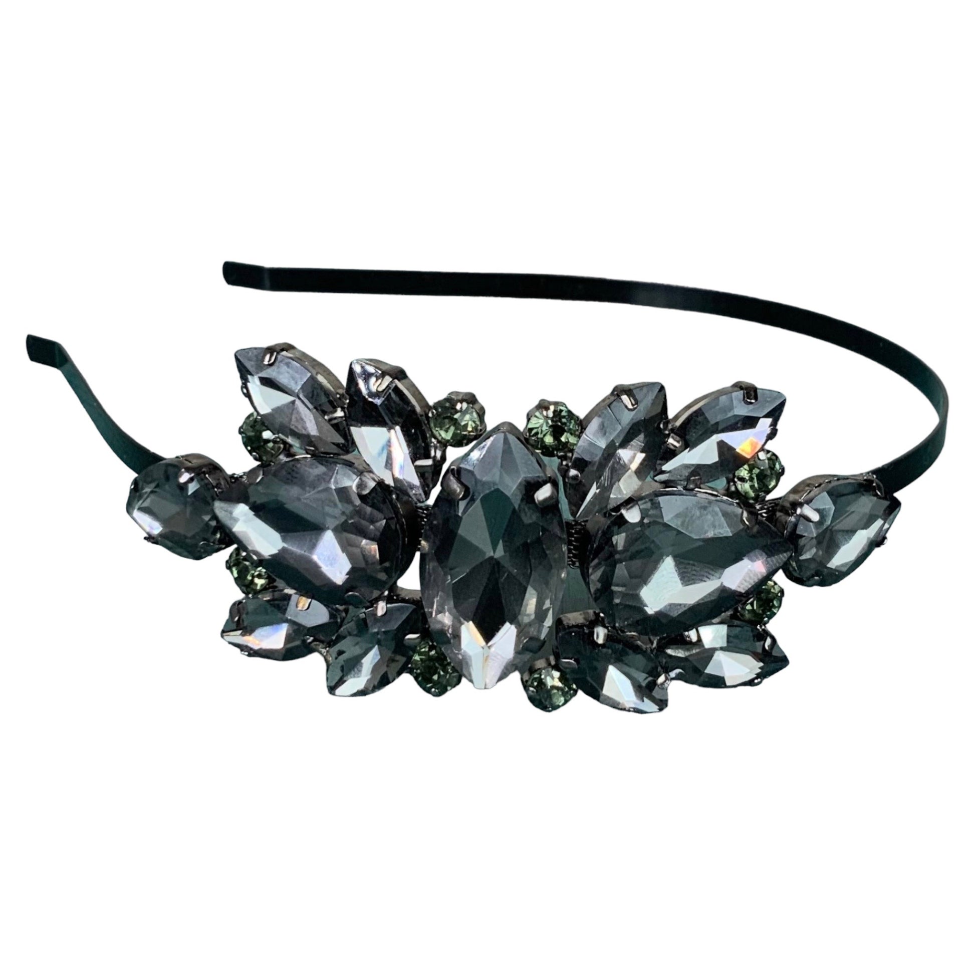 Smoky Gray Quartz Rhinestones with Light Green Accents Metal Headband
